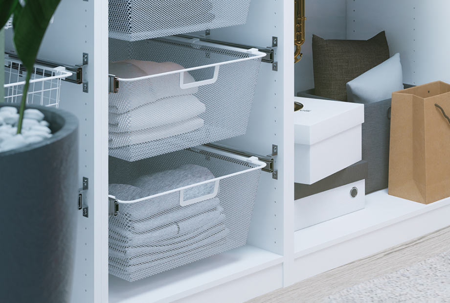 В высокие шкафы добавьте дополнительные полки или корзины для бытовых мелочей