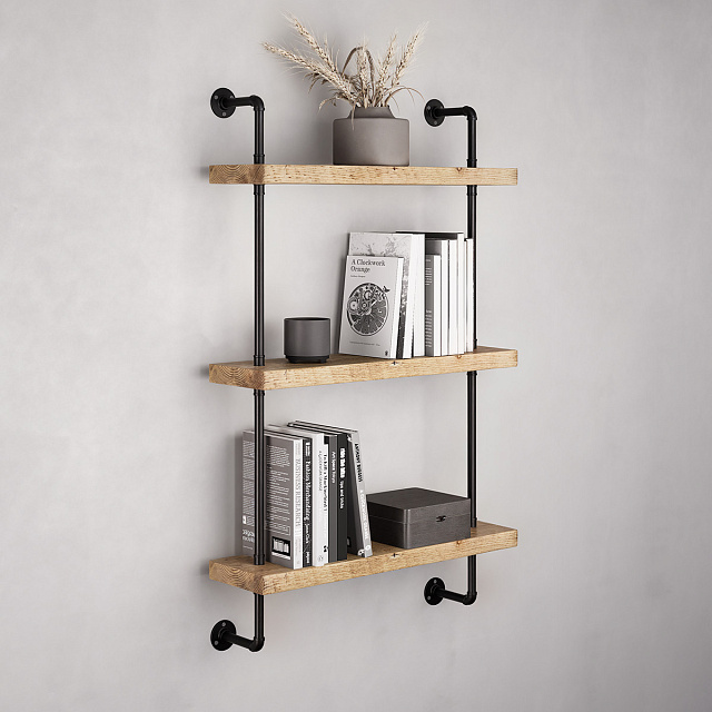 PIPE25BL_NOK с тремя полками в цвете дуб - уникальное сочетание природного и индустриального, самобытный предмет интерьера с характером и историей.