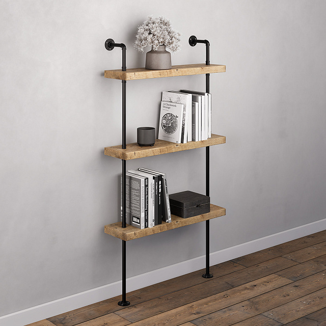 PIPE27BL_NOK с тремя полками в цвете дуб - уникальное сочетание природного и индустриального, самобытный предмет интерьера с характером и историей.