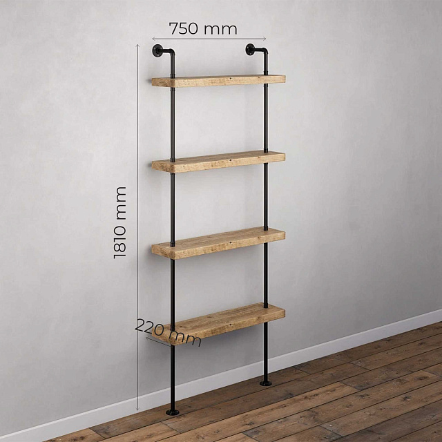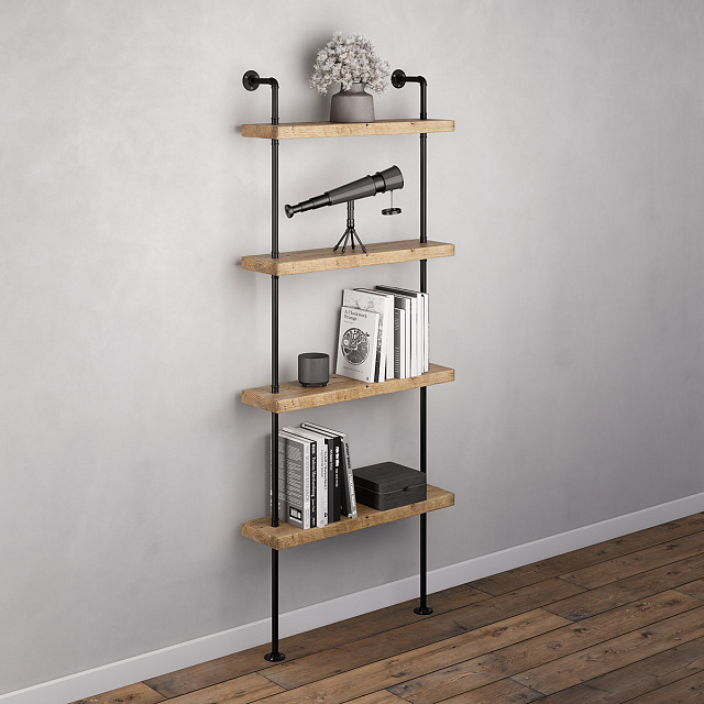 PIPE28BL_NOK с четырьмя полками в цвете дуб - уникальное сочетание природного и индустриального, самобытный предмет интерьера с характером и историей.