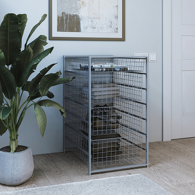 Металлическая тумба серого цвета с проволочными корзинами в 7 ярусов. Идеально подойдет для хранения самых разнообразных предметов, одежды, инвентаря.