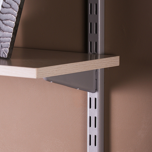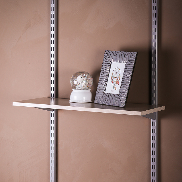 Навесьте пару кронштейнов на стойки и разместите сверху полку глубиной не более 260 мм и шириной не более 800 мм. Зафиксируйте деревянную полку саморезами.