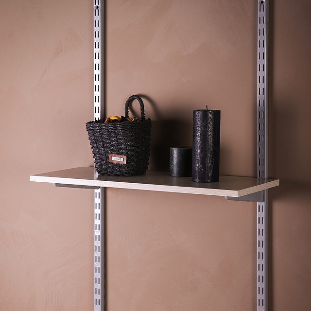 Навесьте пару кронштейнов на стойки и разместите сверху полку глубиной не более 340 мм и шириной не более 800 мм. Зафиксируйте деревянную полку саморезами.