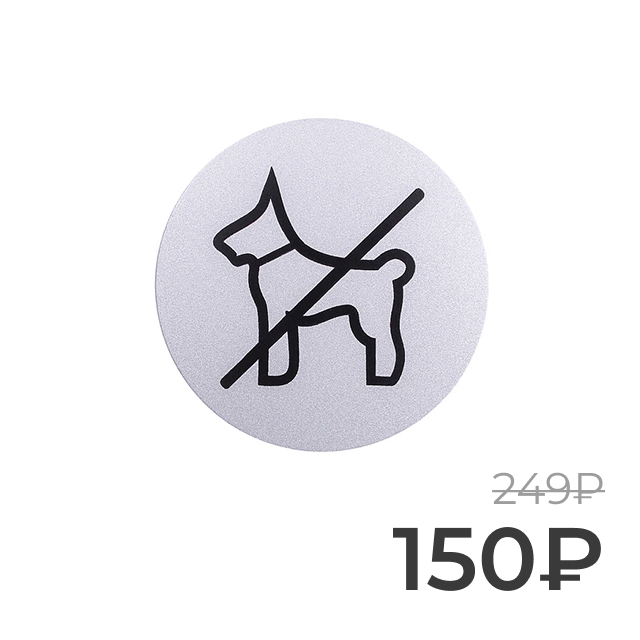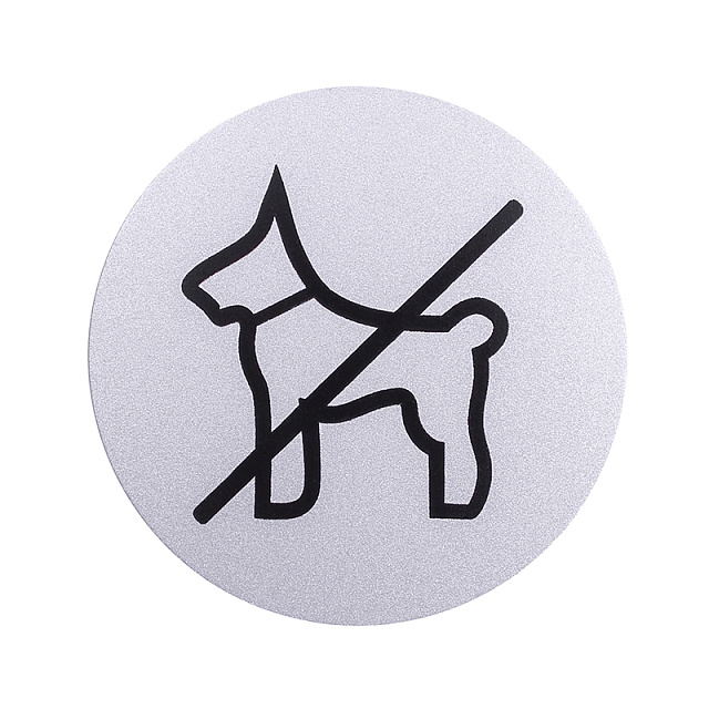 Серебрянная информационная табличка "С животными нельзя" круглой формы для обозначения помещений с ограничением передвижения питомцев. Долговечная и практичная. Подходит для дверей и стен.