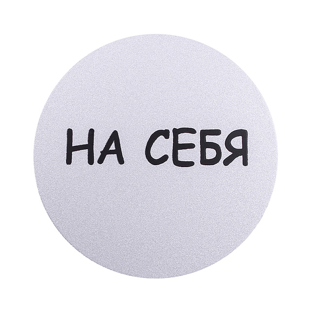 Серебрянная информационная табличка "На себя" круглой формы для обозначения ориентации открывания двери. Подходит для дверей.