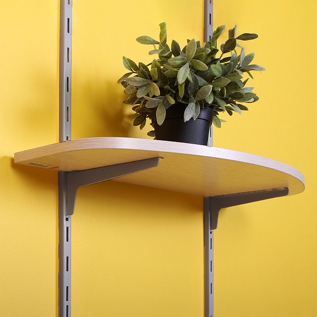 Навесьте кронштейны на стойку перфорации. Отметьте точки фиксации полки и закрепите ее на кронштейны подходящими саморезами. Не рекомендуется устанавливать полку, чей свес с кронштейна превышает треть глубины самой полки.