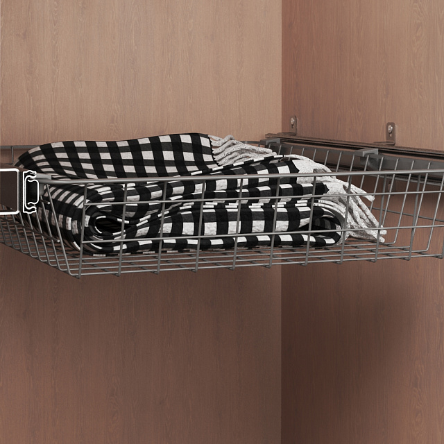 Для установки корзин используются телескопические направляющие. Достаньте из направляющих выдвижные элементы и установите на них пластиковые фиксаторы. Затем установите их на боковые рёбра корзины. Оставшиеся планки прикрутите к стенкам шкафа с помощью саморезов. Вденьте корзину с выдвижными элементами в направляющие.
