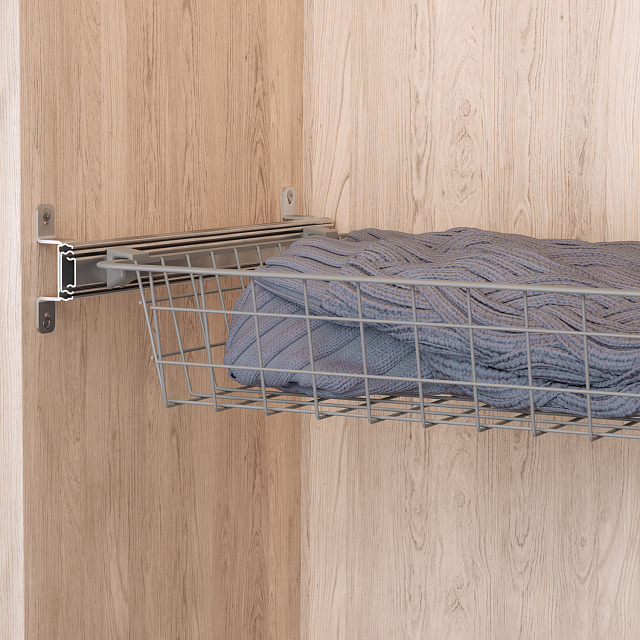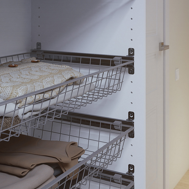 Для установки корзин используются телескопические направляющие. Достаньте из направляющих выдвижные элементы и установите на них пластиковые фиксаторы. Затем установите их на боковые рёбра корзины. Оставшиеся планки прикрутите к стенкам шкафа с помощью саморезов. Вденьте корзину с выдвижными элементами в направляющие.