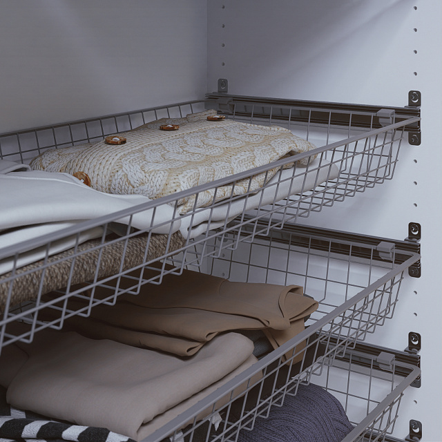 Для установки корзин используются телескопические направляющие. Достаньте из направляющих выдвижные элементы и установите на них пластиковые фиксаторы. Затем установите их на боковые рёбра корзины. Оставшиеся планки прикрутите к стенкам шкафа с помощью саморезов. Вденьте корзину с выдвижными элементами в направляющие.