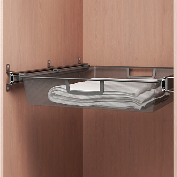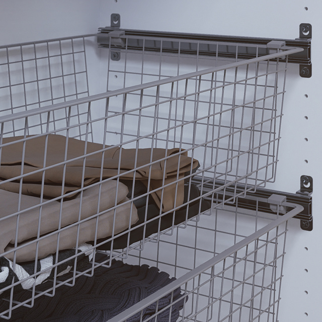Для установки корзин используются телескопические направляющие. Достаньте из направляющих выдвижные элементы и установите на них пластиковые фиксаторы. Затем установите их на боковые рёбра корзины. Оставшиеся планки прикрутите к стенкам шкафа с помощью саморезов. Вденьте корзину с выдвижными элементами в направляющие.