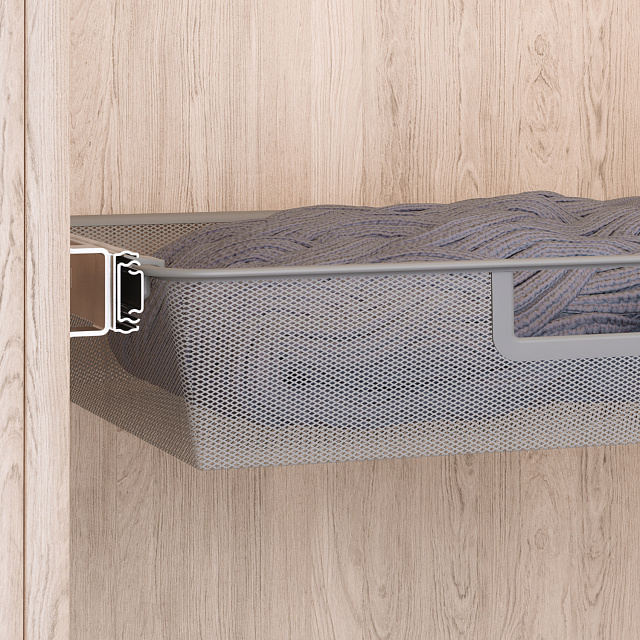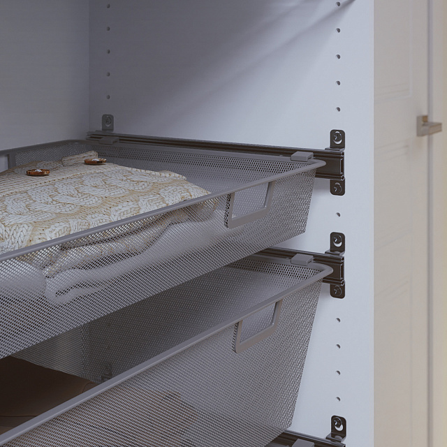Для установки корзин используются телескопические направляющие. Достаньте из направляющих выдвижные элементы и установите на них пластиковые фиксаторы. Затем установите их на боковые рёбра корзины. Оставшиеся планки прикрутите к стенкам шкафа с помощью саморезов. Вденьте корзину с выдвижными элементами в направляющие.