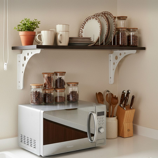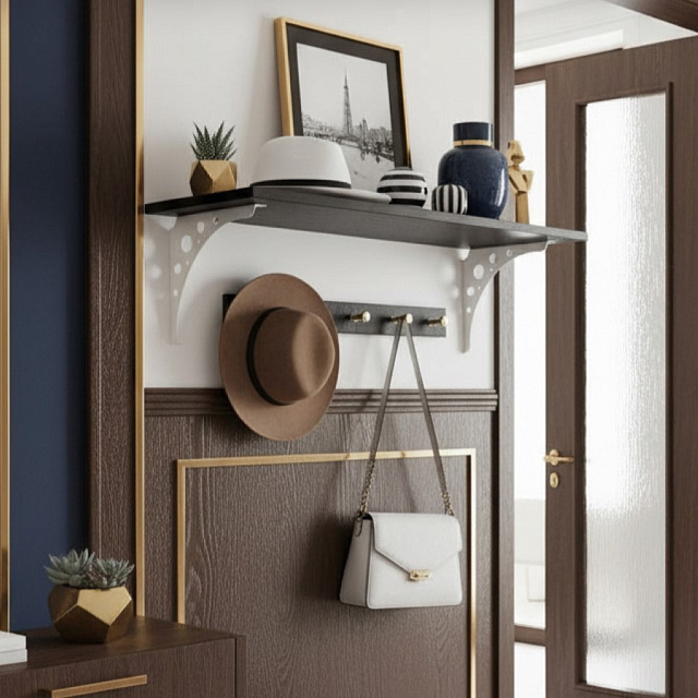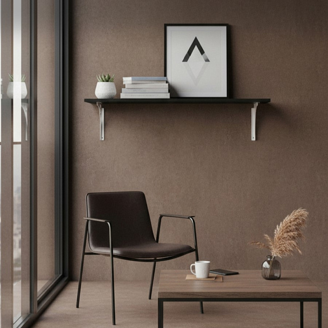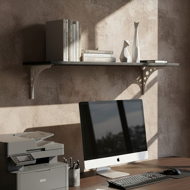 Кронштейн элегантный, необычный и современный. Он имеет форму молодого месяца и предназначен для установки деревянных полок.