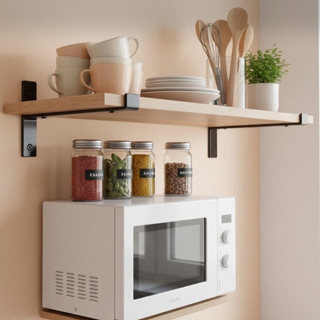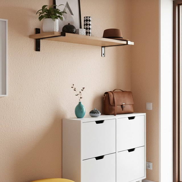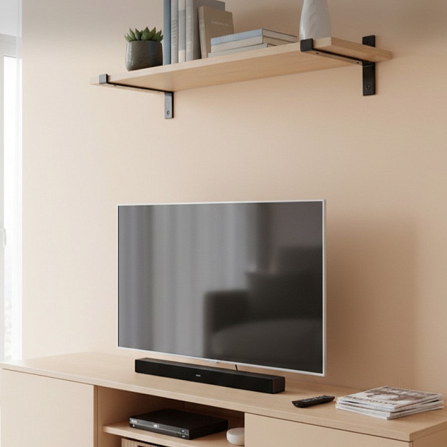 Стальной кронштейн с загибом для прочной фиксации деревянной полки. Благодаря простому дизайну органично вписывается в минималистичный интерьер. Для установки необходимы четыре дюбеля и самореза.