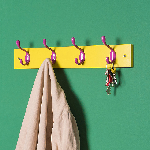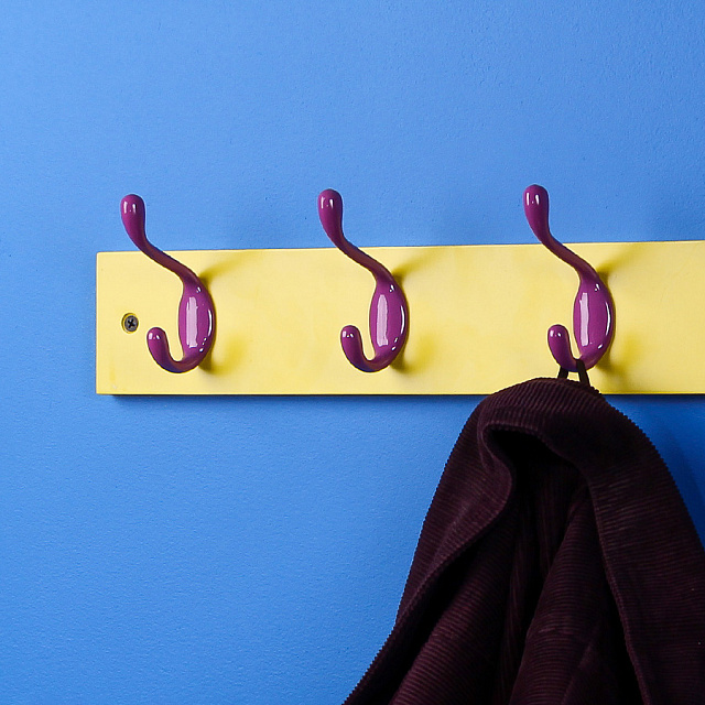 Прочная, стильная и веселая вешалка с 4-мя крючками для пальто и шапок в желтом и феолетовом цветах. Абсолютно природное сочетание (достаточно вспомнить «анютины глазки»), которым, тем не менее, нельзя злоупотреблять в связи с мощнейшей визуальной силой обоих цветов. Их соотношение образует энергичный и даже драматичный интерьер, который вполне подойдет поклонникам экстремального, провокационного стиля жизни.