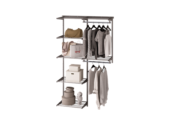 Полноценная серая гардеробная, состоящая из 7 вместительных полок и 2 перекладин для вешалок. Оптимальный вариант организации порядка в доме, который подойдет для прихожей, спальни или детской комнаты.
