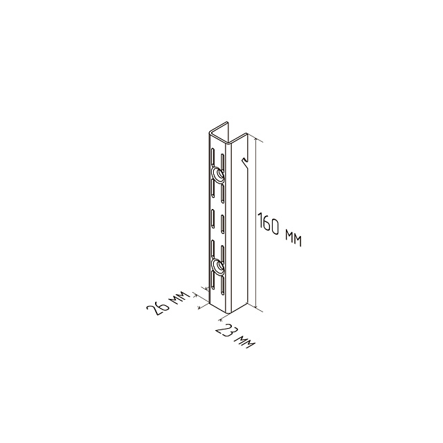 Серая металлическая стеновая стойка. Один из основных элементов системы хранения, на который навешиваются кронштейны и функциональные элементы для хранения.