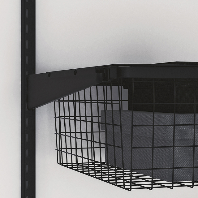 Через специальные пазы повесьте стойку на закрепленный к стене рельс. После установки всех элементов системы хранения зафиксируйте стойки крепежом, соответствующим типу стены, через специальные отверстия вдоль стоек.