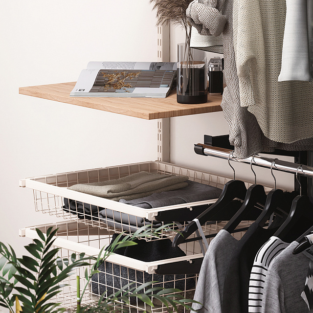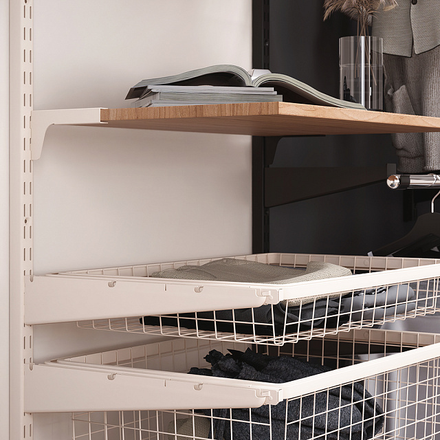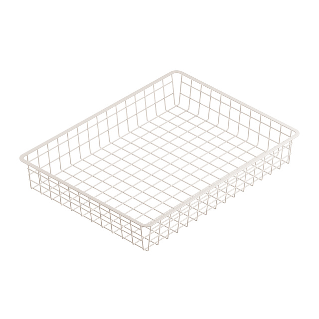 Неглубокая проволочная корзина цвета магнолии. Корзины могут быть использованы в гардеробной системе и металлических тумбах. Оптимальное решение для хранения белья, полотенец, головных уборов и крупных аксессуаров, спортивного и садового инвентаря, игрушек, книг, документов и канцелярии.
