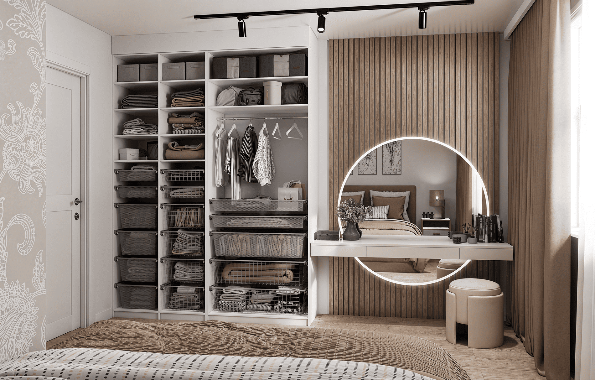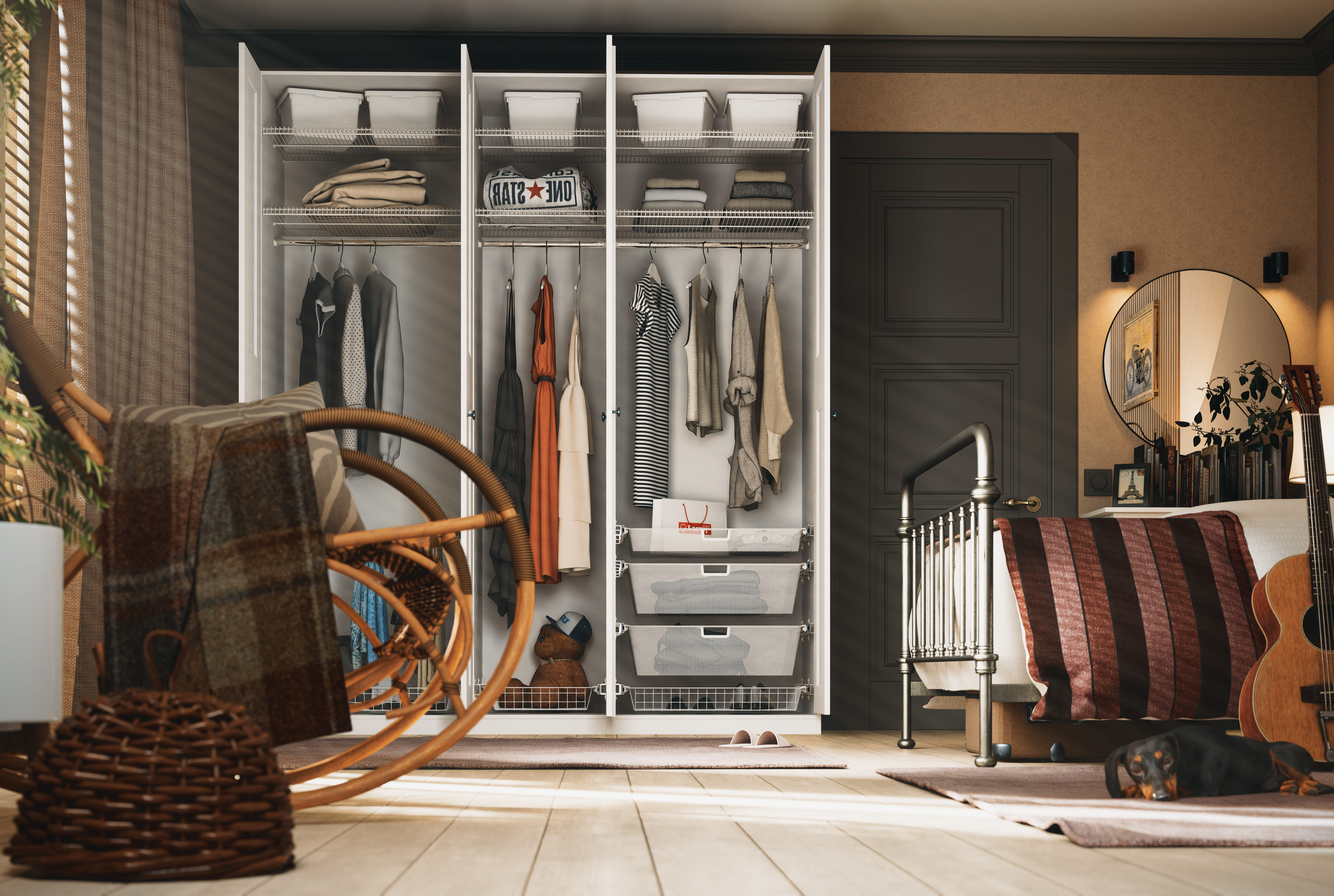 Шкаф с наполнением — готовое решение для умного хранения. Его практичная начинка с множеством полок и корзин превращает даже стандартную комнату в пространство с безупречной организацией вещей