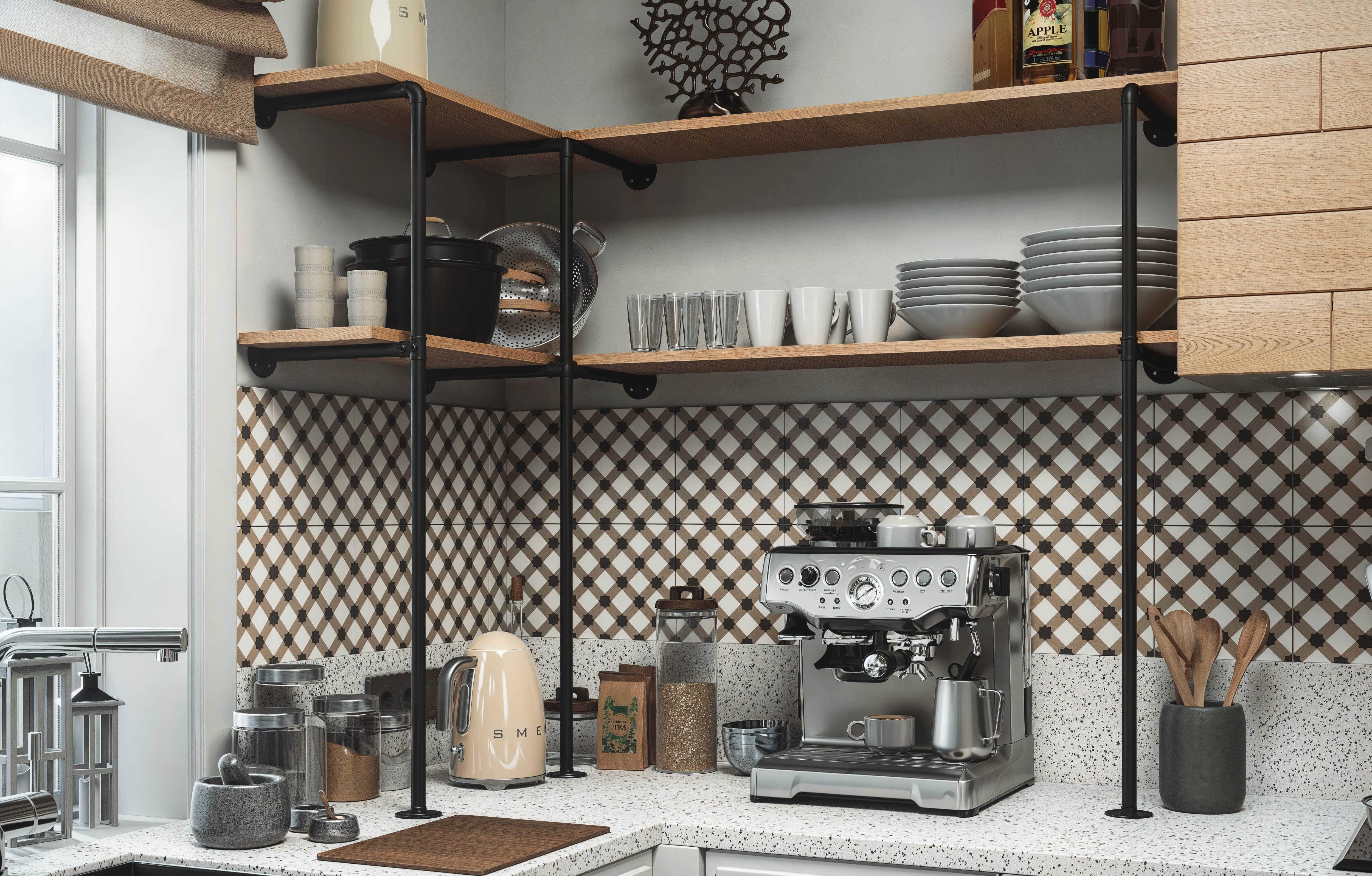 Актуальное открытое хранение вместо громоздких шкафов. Стильные трубы в стиле лофт с аккуратными полками создают современный и динамичный интерьер. Идеальное решение для тех, кто ценит в кухне не только функциональность, но и ощущение простора