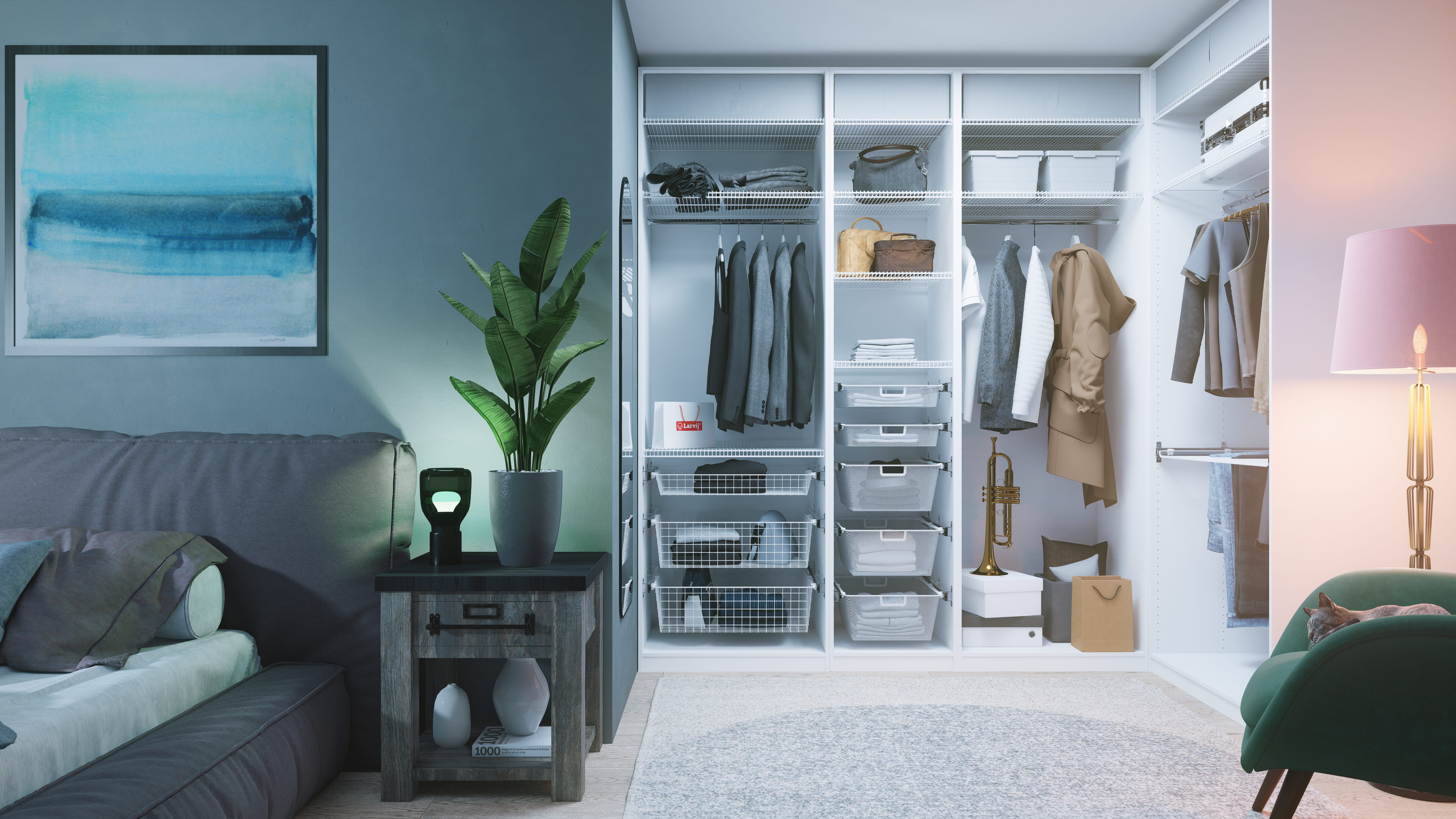 Гардеробная система с вертикальным хранением на вешалках и прочными полками и корзинами. Мелкосеточное наполнение убережет даже крохотные аксессуары и украшения