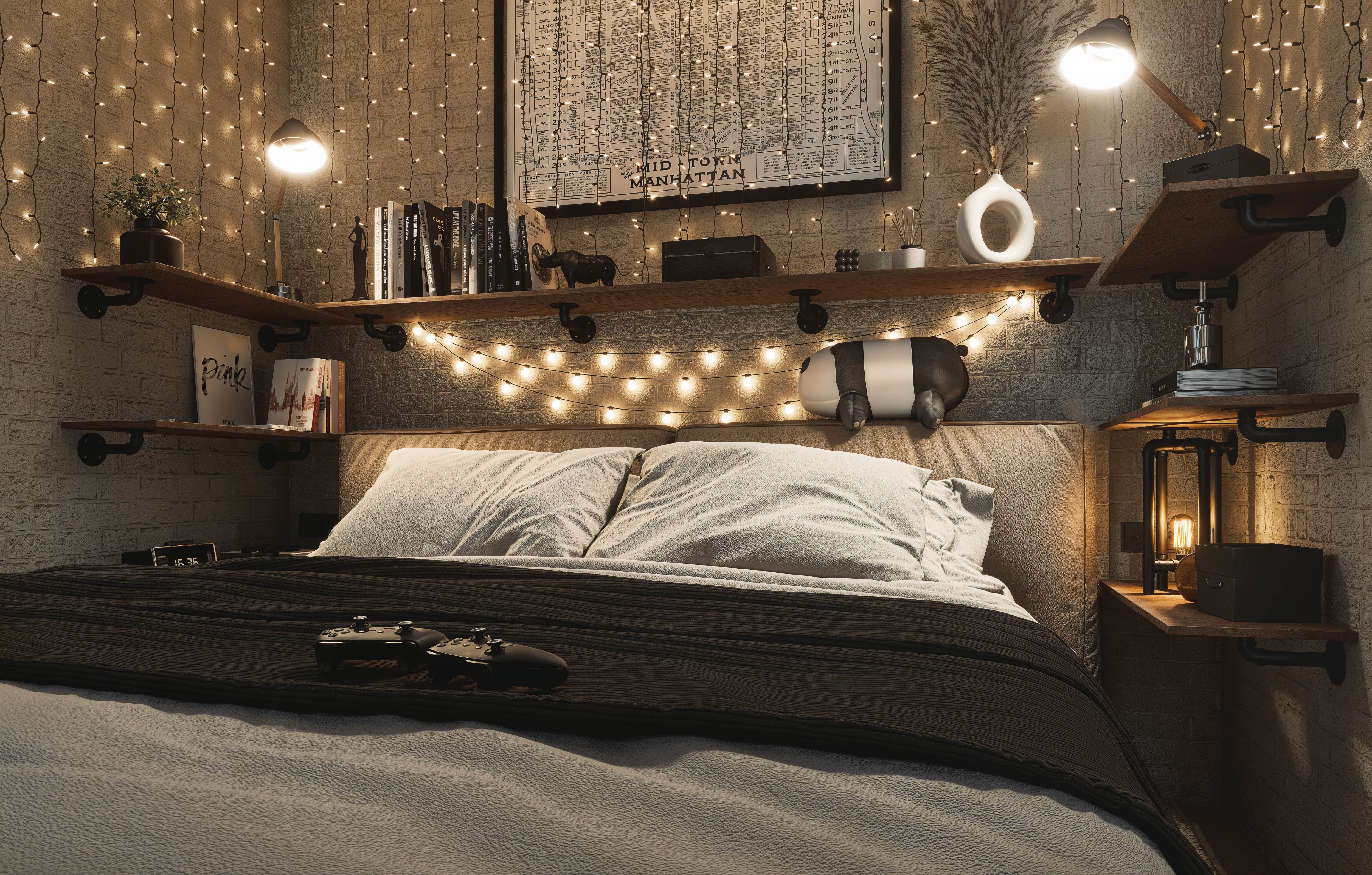 Простой и неординарный вариант оформления дополнительного хранения на полках. Трубы с соединителями не только выглядят интересно и броско, но и отвечают функциональности, выполняя роль кронштейнов
