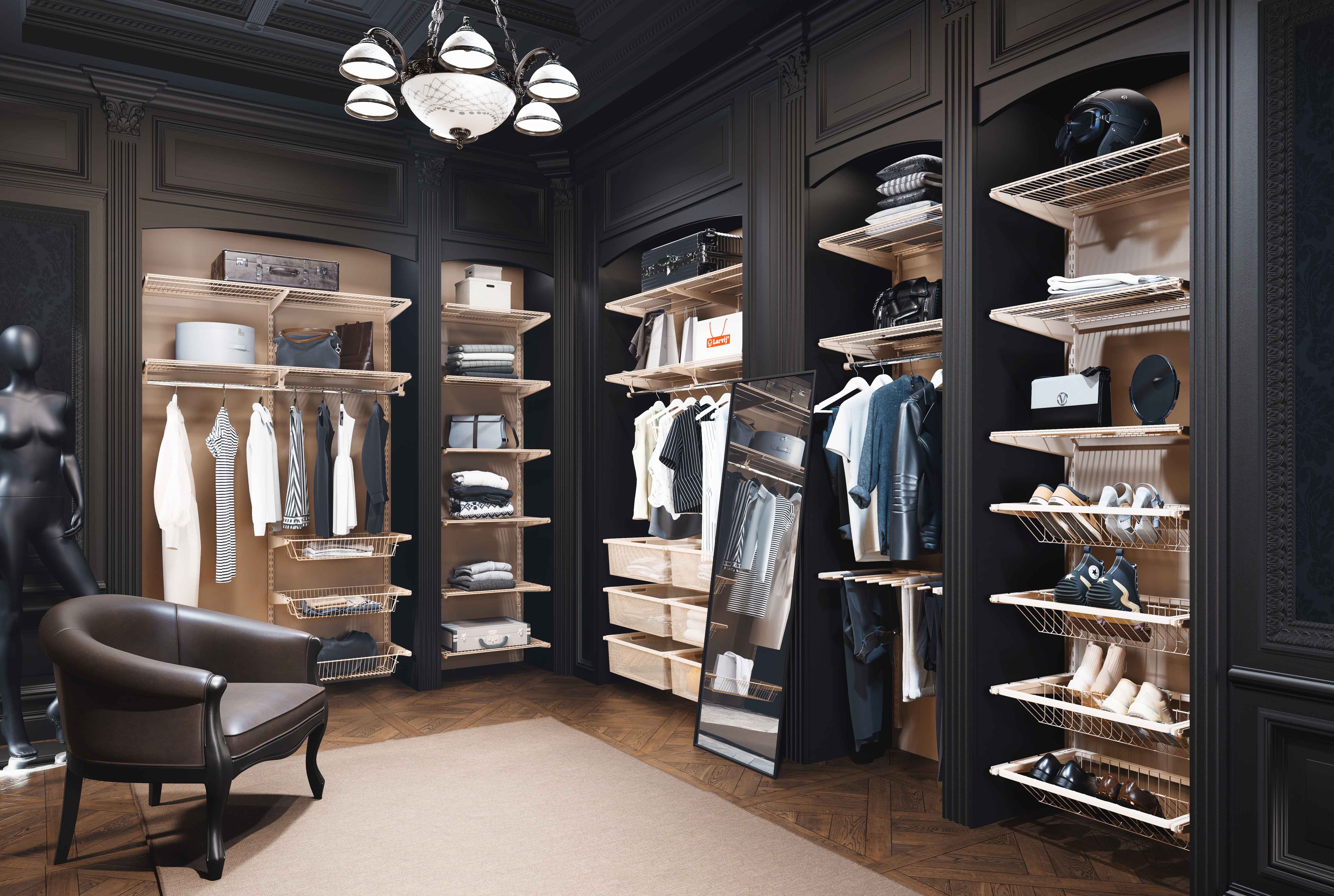 Современные металлические системы гармонично вписываются даже в классический интерьер, создавая выразительный контраст материалов. При этом они обладают всем функционалом полноценной гардеробной, предлагая продуманные решения для хранения